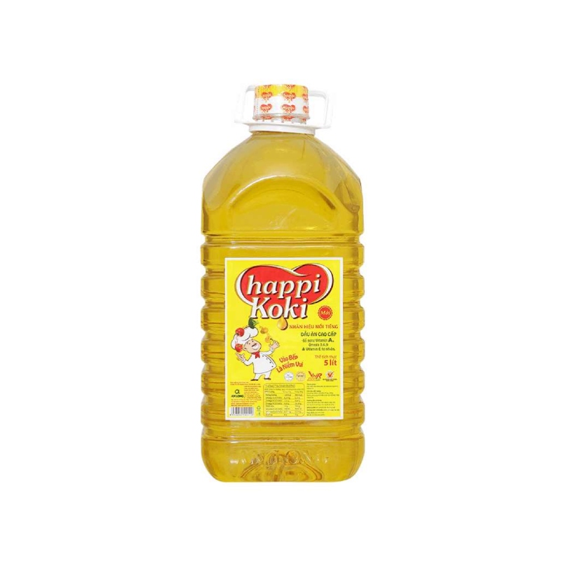 Dầu ăn cao cấp Happy Koki can 5 lít là sản phẩm dầu ăn có nguồn gốc 100% từ thực vật thích hợp chế biến thực phẩm từ chiên, xào, ướp các món mặn cho đến món chay.